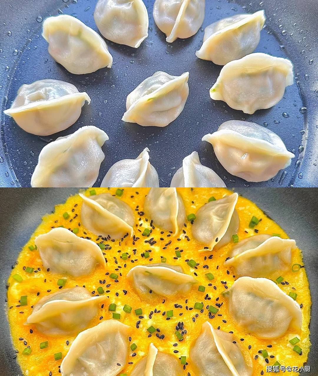 2️⃣倒入清水没过饺子三分之一,盖上盖子中小火焖煮至水分收干,沿着锅边淋入蛋液;