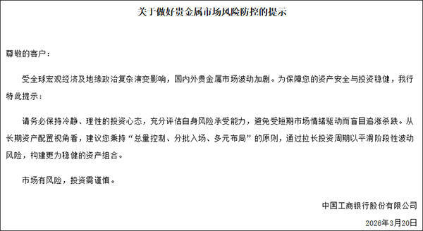此外,中国工商银行还于3月23日转发了上海黄金交易所关于做好近期市场风险控制工作的通知。其中称,近期影响市场不稳定的因素较多,贵金属价格波动显著加剧。请各会员单位密切关注市场行情变化,做细做好风险应急预案,维护市场平稳运行。同时,提示投资者做好风险防范工作,合理控制仓位,理性投资。