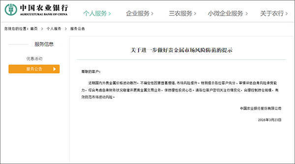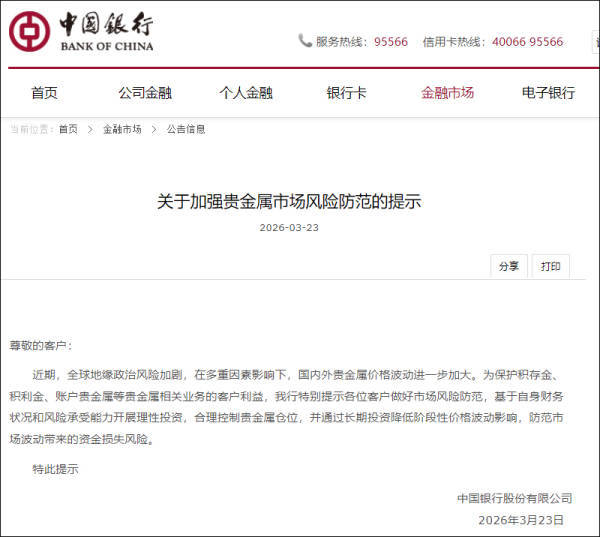 中国银行:近期,全球地缘政治风险加剧,在多重因素影响下,国内外贵金属价格波动进一步加大。为保护积存金、积利金、账户贵金属等贵金属相关业务的客户利益,我行特别提示各位客户做好市场风险防范,基于自身财务状况和风险承受能力开展理性投资,合理控制贵金属仓位,并通过长期投资降低阶段性价格波动影响,防范市场波动带来的资金损失风险。