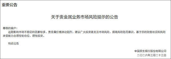 中国民生银行:近期影响市场不稳定的因素较多,贵金属价格波动剧烈,建议广大投资者关注市场风险,提高风险防范意识,基于您的财务状况和风险承受能力合理控制仓位,理性投资。