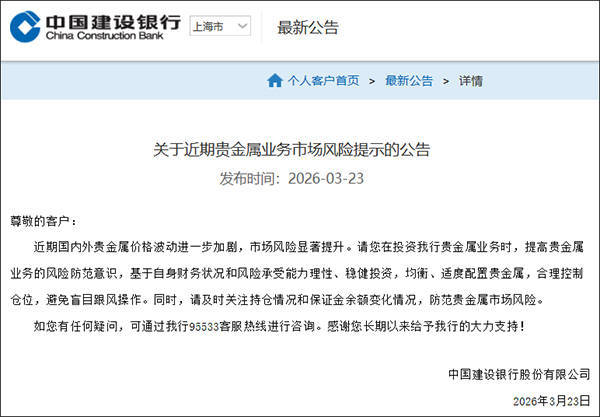 中国建设银行:近期国内外贵金属价格波动进一步加剧,市场风险显著提升。请您在投资我行贵金属业务时,提高贵金属业务的风险防范意识,基于自身财务状况和风险承受能力理性、稳健投资,均衡、适度配置贵金属,合理控制仓位,避免盲目跟风操作。同时,请及时关注持仓情况和保证金余额变化情况,防范贵金属市场风险。