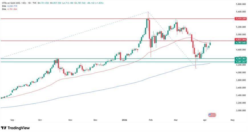 截至撰稿,黄金交投于4780美元/盎司附近,涨幅接近2%,盘中一度上涨约4%,最高触及4857美元。下图中标注的局部阻力位与50日指数移动均线(EMA)共同构成压制,阻挡了进一步上涨。这个位置大致位于自1月创下历史高点以来形成的整理区间中部。