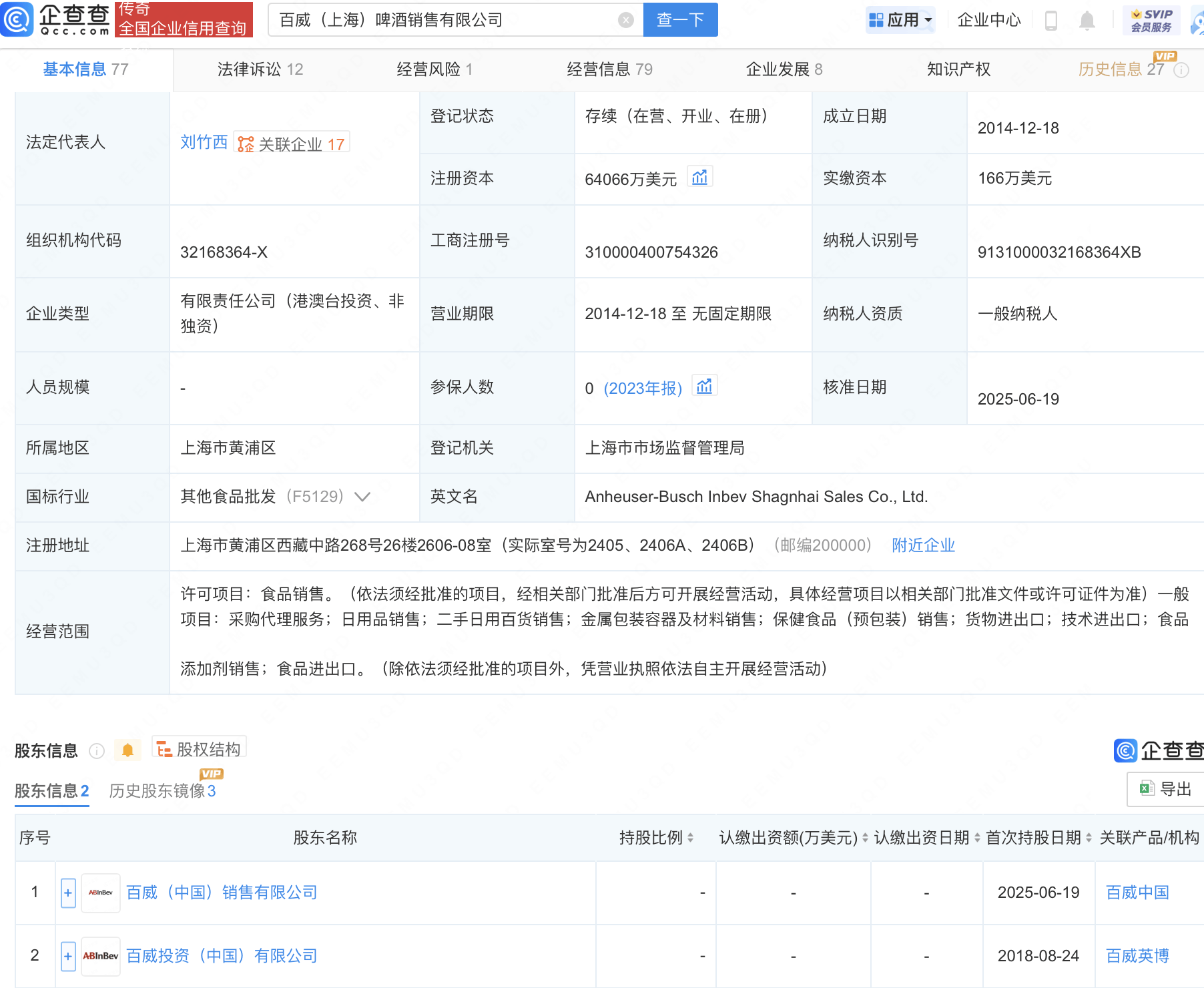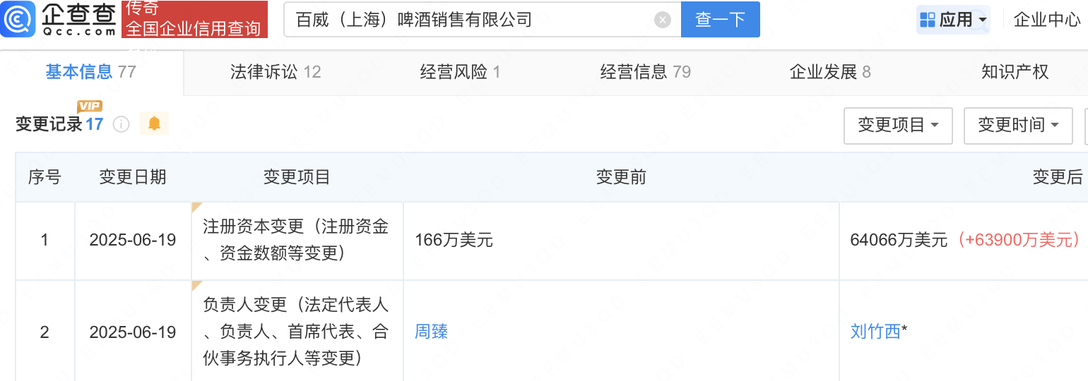 企查查APP显示,近日,百威(上海)啤酒销售有限公司发生工商变更,新增百威(中国)销售有限公司为股东,注册资本由166万美元增至约6.4亿美元,同时,法定代表人由周臻变更为刘竹西。企查查信息显示,该公司成立于2014年,经营范围含食品销售、采购代理服务、日用品销售、二手日用百货销售等。