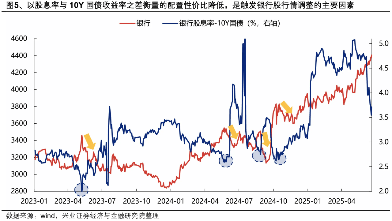 兴业证券表示,对于银行这类配置型资产来说,流动性和情绪并不是决定其配置价值的主要矛盾,配置性价比降低才是触发行情调整的主要因素。以银行股息率与10Y国债收益率之差衡量其配置性价比,历史上,当股价上升导致息差收窄至2.5%左右水平时,往往会触发行情较大幅度的调整,而当股价下跌推动息差扩大、配置性价比再度提升时,银行股行情往往能延续并再创新高。当前来看,银行股息率与10Y国债收益率之差仍在3.5%以上的较高水平,行情延续的核心逻辑未被显著破坏。随着中报季临近,可以持续关注基本面、分红率等价值指标的变化。