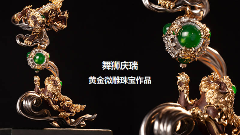第三个是我个人的新作品——舞狮庆瑞黄金微雕珠宝作品。这个作品的灵感来源是中国一句老话:狮子滚绣球,好事在后头。我突破性地使用了海南黄花梨,狮子的身体是用海南黄花梨来雕刻的。木头、黄金的组合实际上是突破性的难点,可以看到狮子的毛发,是完全包裹在木头上面的,实际上在一个高级珠宝里面,是不可能出现拿胶粘的可能性的,所以我就运用了中国类似于建筑结构里的榫卯结构,我们能看到所有狮子上面的毛,爪子上的火焰,只要有前后关系的,我们会有一个对穿的结构,穿透了木头,用金属锁定这个木头。为了佩戴的舒适感,我使用了大家常用的轻盈的材料钛,做了缠绕,能立得住狮子的同时,同时还有观感。
