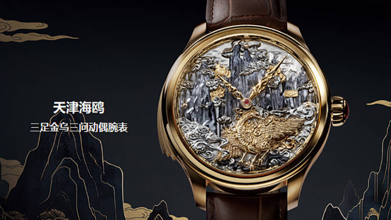 第一个天津海欧——三足金乌三问动偶腕表。我们目前看到这支表是中国最复杂的黄金微雕动偶三问腕表,看到目前这只三足金乌,它的灵感来源是中国神话太阳神鸟,翅膀打开会有声音的,后面的云、太阳可以升起来,根据声音有规律地起和落。我们把三足金乌做了很多拆件,表盘及动件由100多个金雕配件组合而成,不足5毫米的空间10余层组件紧密结合,最薄一层仅为0.1毫米,每一次报时,金乌振翅,10点钟方向太阳升起,云朵相伴,近百个精密部件协同运作,机械之美与神话意境完美融合,是中国传统文化内容和高级机械制造的完美结合。艺术设计与雕刻技艺,为一支高精密机械腕表增添了故事和文化的光彩。