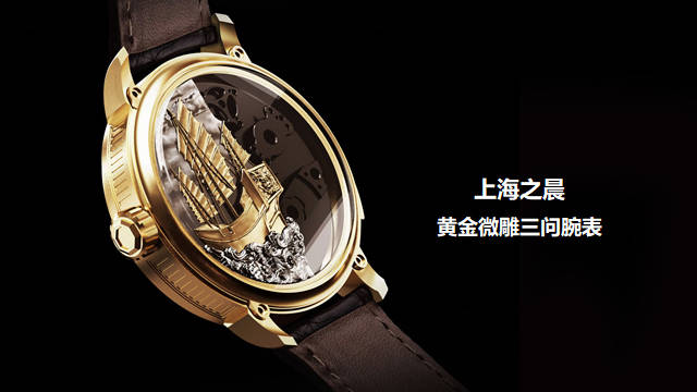 第二个是上海表——上海之晨三问腕表。在大部分老上海人的回忆里,每天的早晨是被上海的海关大楼钟声唤醒的,我当时接到这个设计的时候,我在想,如果一个海关大楼能带来这些回忆,那么我们一定是需要有一个独特的视角。我把海关大楼放在了近景最大的视角,通过海关大楼可以透视俯瞰整个外观,海关大楼的中盘就是小秒针,我还用了超级复杂的宝石切割拼接马赛克,做了表圈最外层的设计和拼接,也是目前已知的在中国腕表上全新的一次挑战,因为它的切割是非常复杂的。我们运用了很多有色的宝石,比如说青筋、珊瑚、松石,已知的彩色宝石,我们为了拼这个图,去拼颜色,在这次尝试中,希望让更多的国际舞台的人,看到中国制造,中国设计,和中国传统纹样,这支表融合了金雕,珠宝,绘画等多重工艺,是艺术工艺类腕表的一次全新挑战。