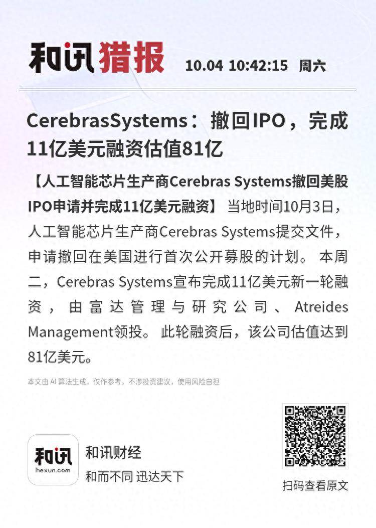 【人工智能芯片生产商Cerebras Systems撤回美股IPO申请并完成11亿美元融资】当地时间10月3日,人工智能芯片生产商Cerebras Systems提交文件,申请撤回在美国进行首次公开募股的计划。本周二,Cerebras Systems宣布完成11亿美元新一轮融资,由富达管理与研究公司、Atreides Management领投。此轮融资后,该公司估值达到81亿美元。