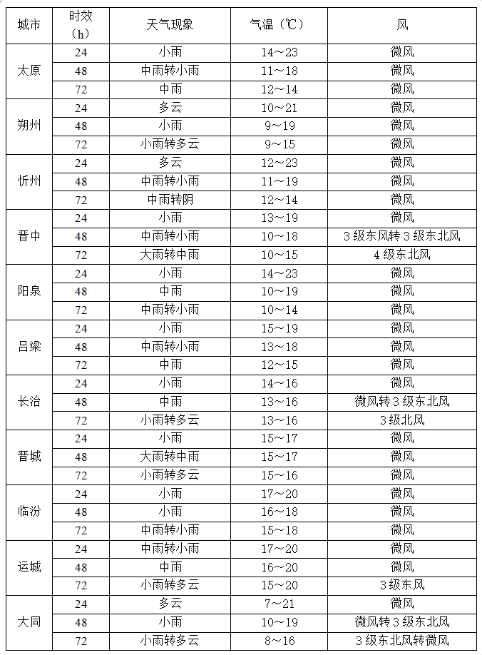 全省都是阴天,小到中雨会覆盖全省,运城、晋城、吕梁、太原、晋中、阳泉的部分地方,还有临汾、长治的局部,可能下大雨;运城、晋城的局部甚至可能下暴雨。另外,北部局部和中南部部分地方会有雾或轻雾。