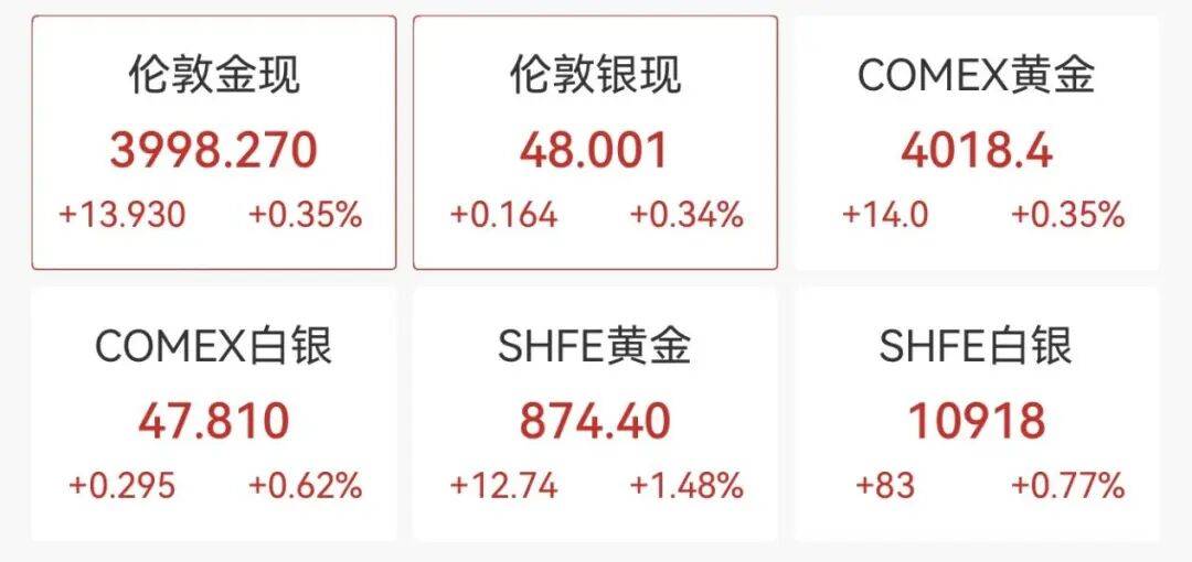 10月8日早盘,黄金期现货集体走高,现货黄金一度突破3999美元/盎司,续创历史新高,逼近4000美元/盎司COMEX黄金期货持续走高,现报4018.4美元/盎司