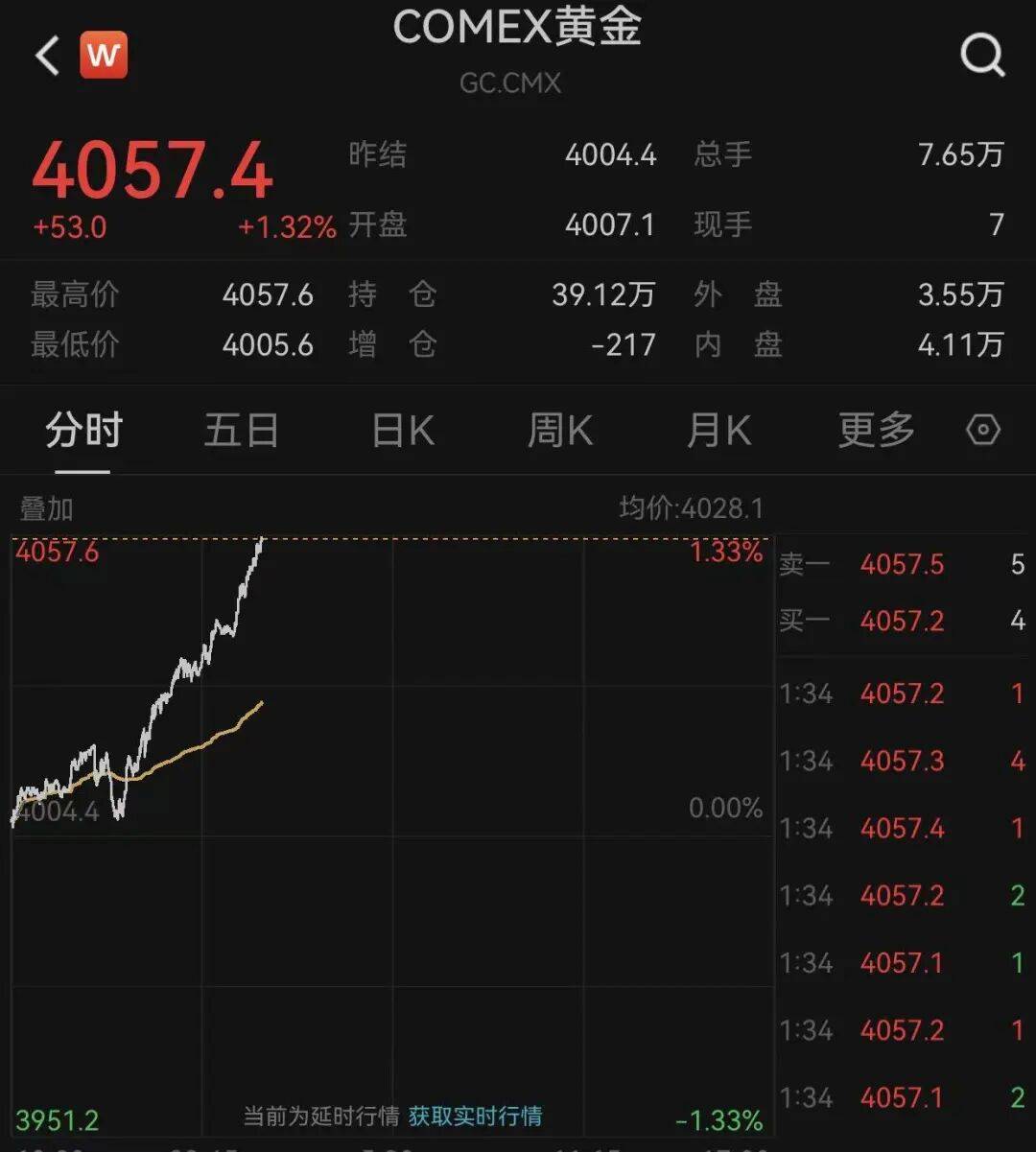 截至发稿,现货黄金涨逾1.2%,涨破4030美元,COMEX黄金则涨破4050美元。
