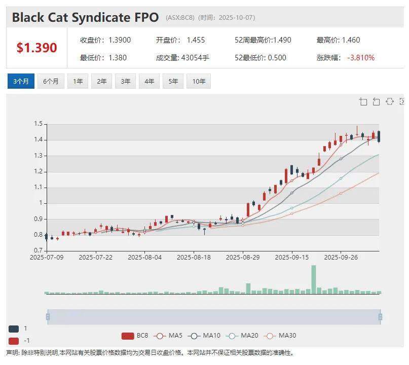 据Black Cat Syndicate(ASX: BC8)周一发布的公告,约14,679,572 份上市期权(BC8O)将于2025年11月14日到期,行权价为每股 0.3375澳元。