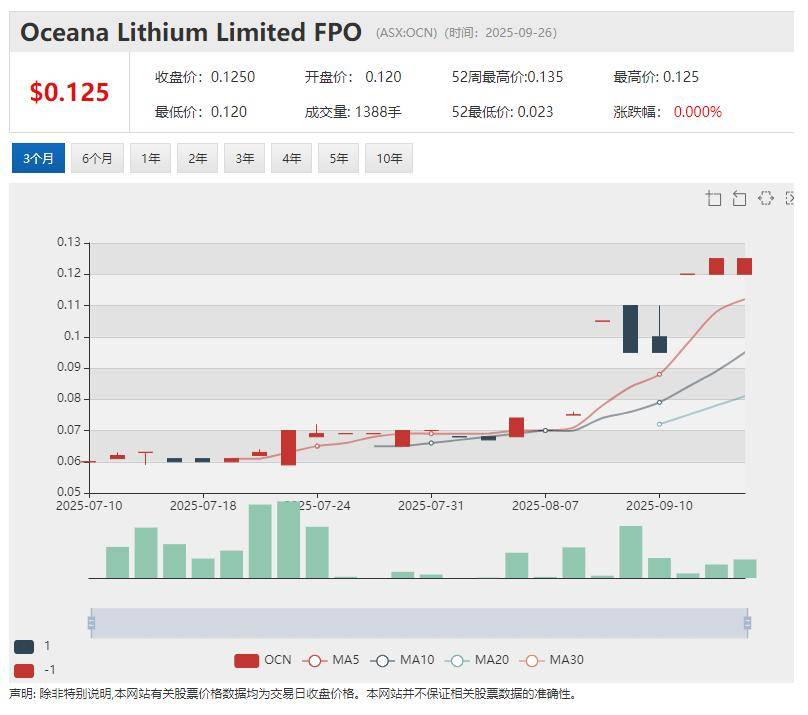 在巴西与澳洲从事锂与稀土勘探的Oceana Lithium Ltd (ASX股票代码:OCN)股价异动,周二飙涨24.00%。