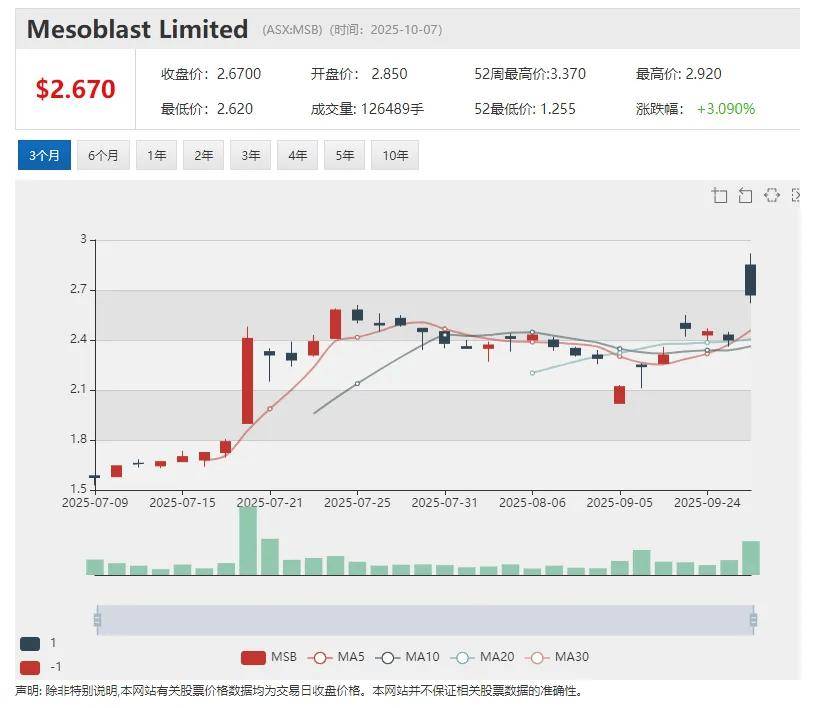 受利好消息推动,Mesoblast 股价上周五盘中强势上涨,一度触及 2.97澳元,创下自今年2月以来的新高。未来一段其股价能否有效突破3澳元并打开进一步上行空间,值得观察。