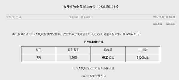 中国人民银行网站10月9日消息,中国人民银行以固定利率、数量招标方式开展了6120亿元7天期逆回购操作,投标量6120亿元,中标量6120亿元,操作利率1.40%。