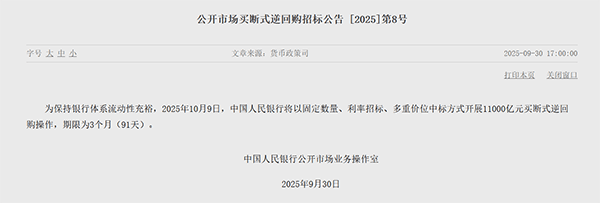此前的9月30日,中国人民银行发布公开市场买断式逆回购招标公告显示,为保持银行体系流动性充裕,2025年10月9日,中国人民银行将以固定数量、利率招标、多重价位中标方式开展11000亿元买断式逆回购操作,期限为3个月(91天)。