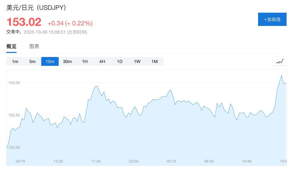 美元兑日元短线拉升,现涨至153,为2月份以来首次,引发了市场对于官方干预的猜测。