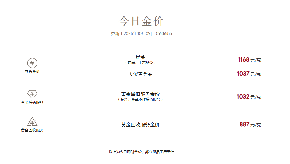 10月9日,周生生足金(饰品、工艺品类)克价冲上1170元,较国庆节前一天(9月30日)上涨45元;周大福、六福足金克价均为1168元,较9月30日的1123元上涨45元;老庙黄金足金为1160元/克,较9月30日上涨34元/克;周六福、老凤祥、潮宏基等品牌足金价格上涨幅度均在30至40元/克之间。