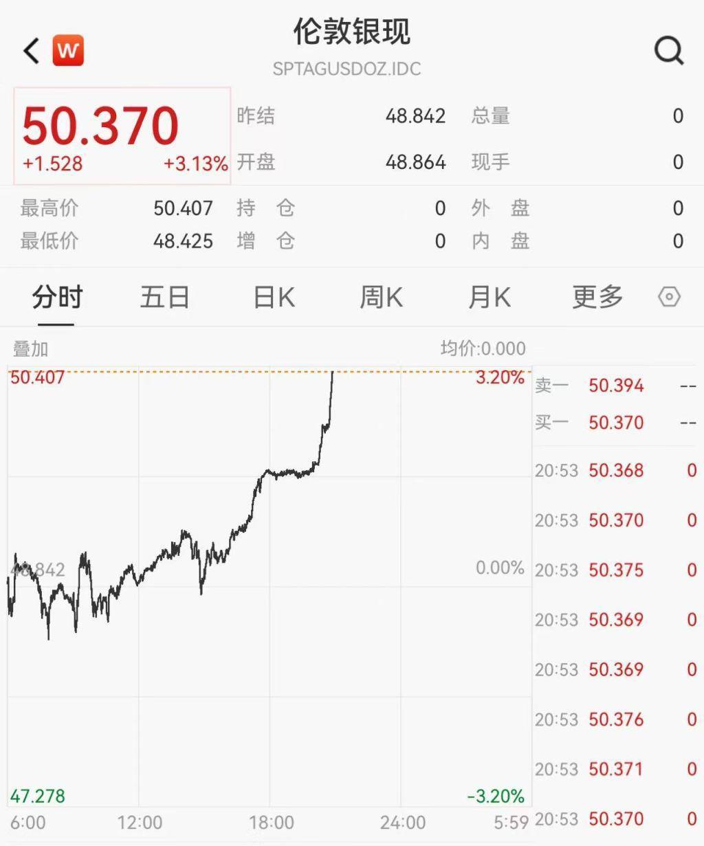 截至记者发稿时,现货白银涨势不止,涨幅扩大至3.13%,报50.37美元/盎司,继续刷新历史纪录,年内累涨逾70%。