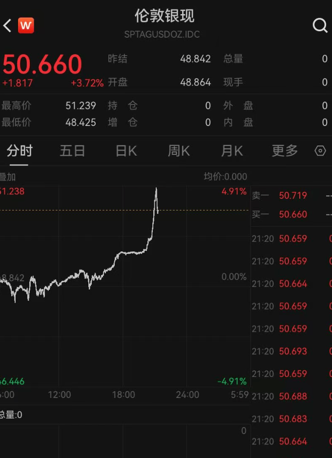 北京时间10月9日晚,现货白银价格加速上涨,历史首次突破50美元/盎司,截至发稿,涨幅为3.72%,报50.66美元/盎司。