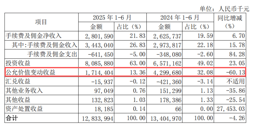 2025年上半年,南京银行录得公允价值变动收益17.14亿元,较上年同期骤降60.13%,直接拖累公司非息收入,即同比下降4.26%至128.34亿元,相当于比上年同期减少5.71亿元。