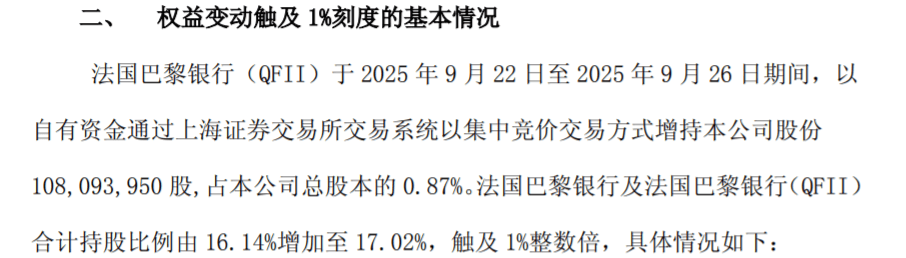 9月28日,该行发布公告称,法国巴黎银行(QFII)于9月22日至9月26日期间,以自有资金通过上交所交易系统买入股份1.08亿股,占其总股本的0.87%。