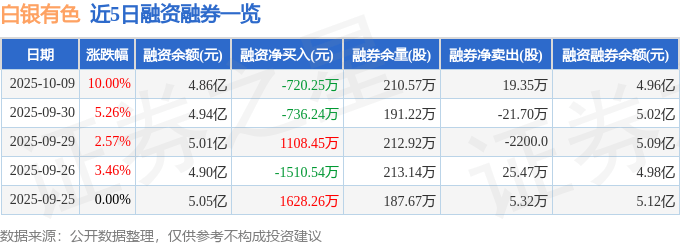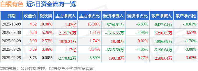 证券之星消息,截至2025年10月9日收盘,白银有色(601212)报收于4.62元,上涨10.0%,涨停,换手率2.47%,成交量182.78万手,成交额8.41亿元。