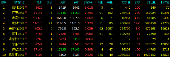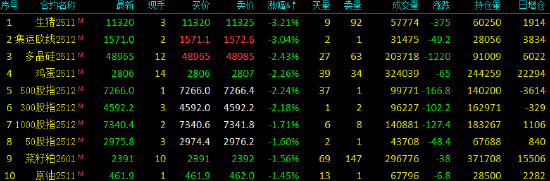 2025年10月10日,国内主力合约跌多涨少。红枣涨超2%,、涨超1%;跌幅方面,集运欧线、生猪跌超3%,鸡蛋、多晶硅跌超2%,菜粕、尿素、SC、沥青、沪金、菜油、沪银、跌超1%。