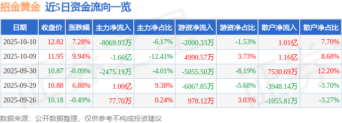 证券之星消息,截至2025年10月10日收盘,招金黄金(000506)报收于12.82元,上涨7.28%,换手率11.48%,成交量106.59万手,成交额13.08亿元。