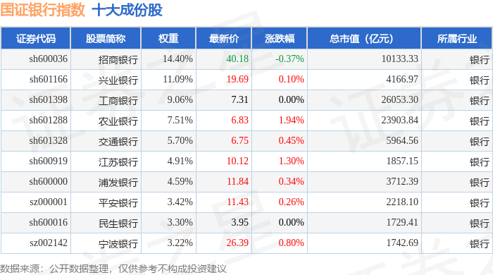 国证银行(399431)指数十大成份股详情如下: