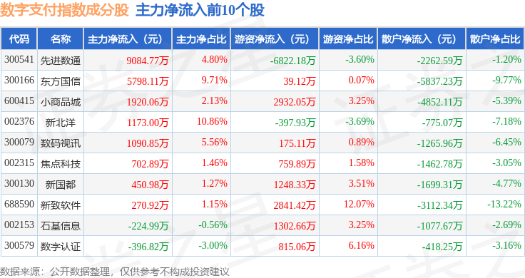 资金流向方面,数字支付(980113)指数成份股当日主力资金净流出合计27.95亿元,游资资金净流入合计11.89亿元,散户资金净流入合计16.06亿元。成份股资金流向详情见下表: