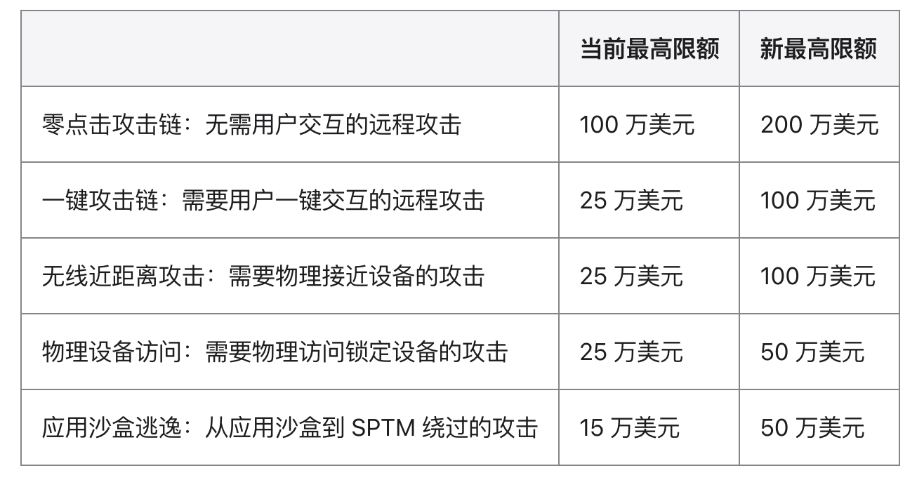 除了流程优化,苹果还扩大了奖励范围,并提升了某些高价值漏洞的奖金。例如: