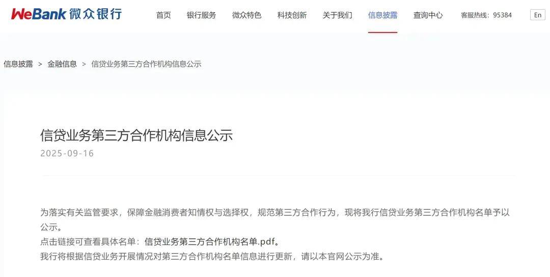 今年9月16日,微众银行官网公布382家信贷业务第三方合作机构信息,其中包括18家营销获客、44家担保增信、320家催收机构。