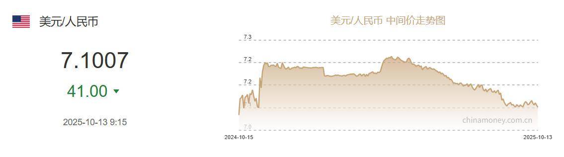 据中国外汇交易中心网站消息,中国人民银行授权中国外汇交易中心公布,2025年10月13日银行间外汇市场人民币汇率中间价为:1美元对人民币7.1007元,上调41个基点。