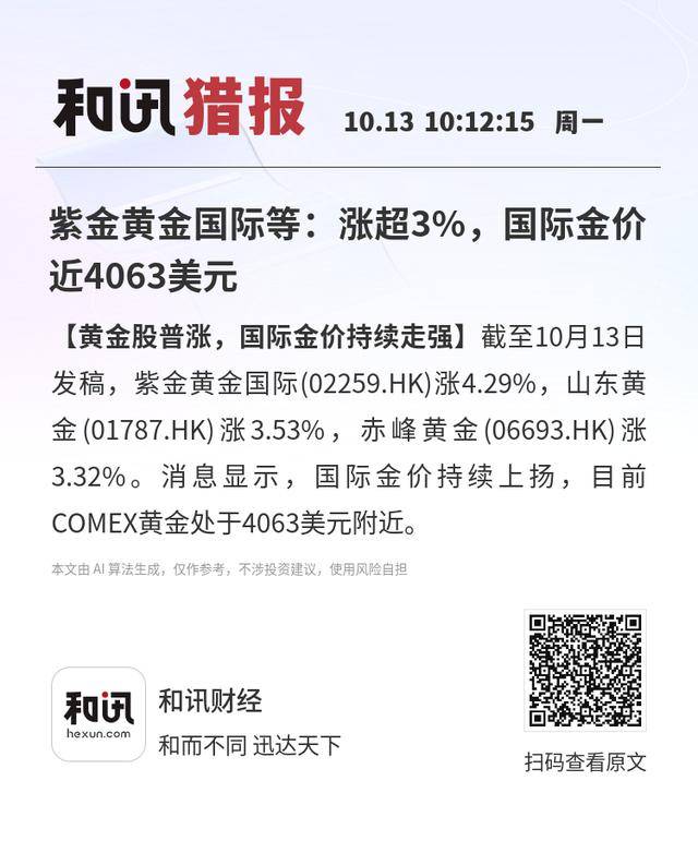 【黄金股普涨,国际金价持续走强】截至10月13日发稿,紫金黄金国际(02259.HK)涨4.29%,山东黄金(01787.HK)涨3.53%,赤峰黄金(06693.HK)涨3.32%。消息显示,国际金价持续上扬,目前COMEX黄金处于4063美元附近。