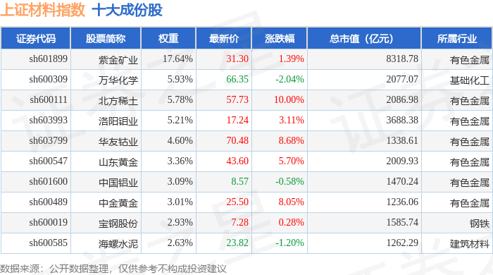 上证材料(000033)指数十大成份股详情如下: