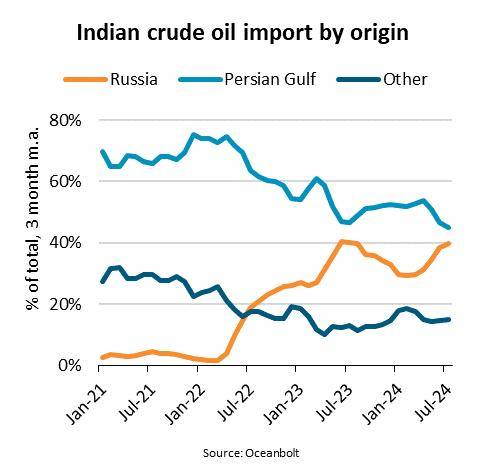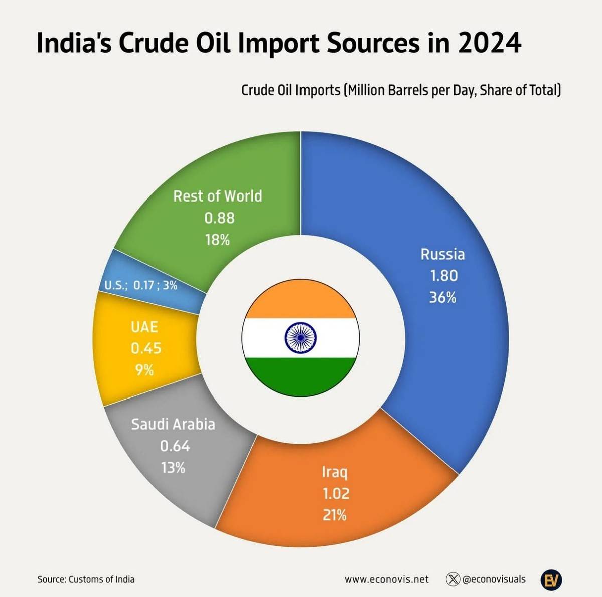 (2024年俄罗斯石油占印度全部石油进口量的约36%)