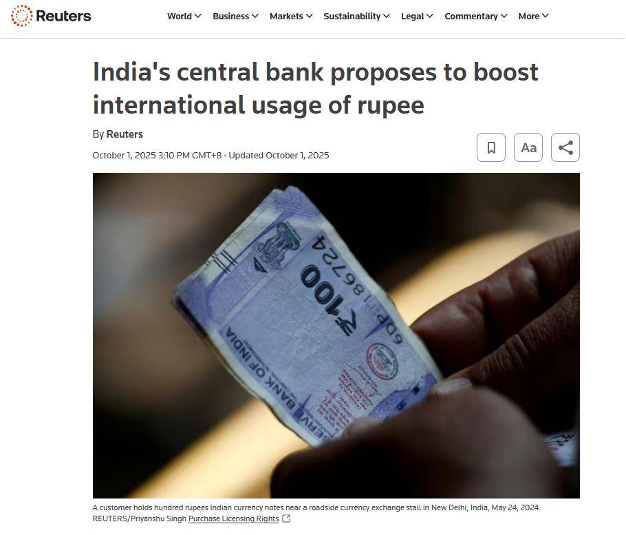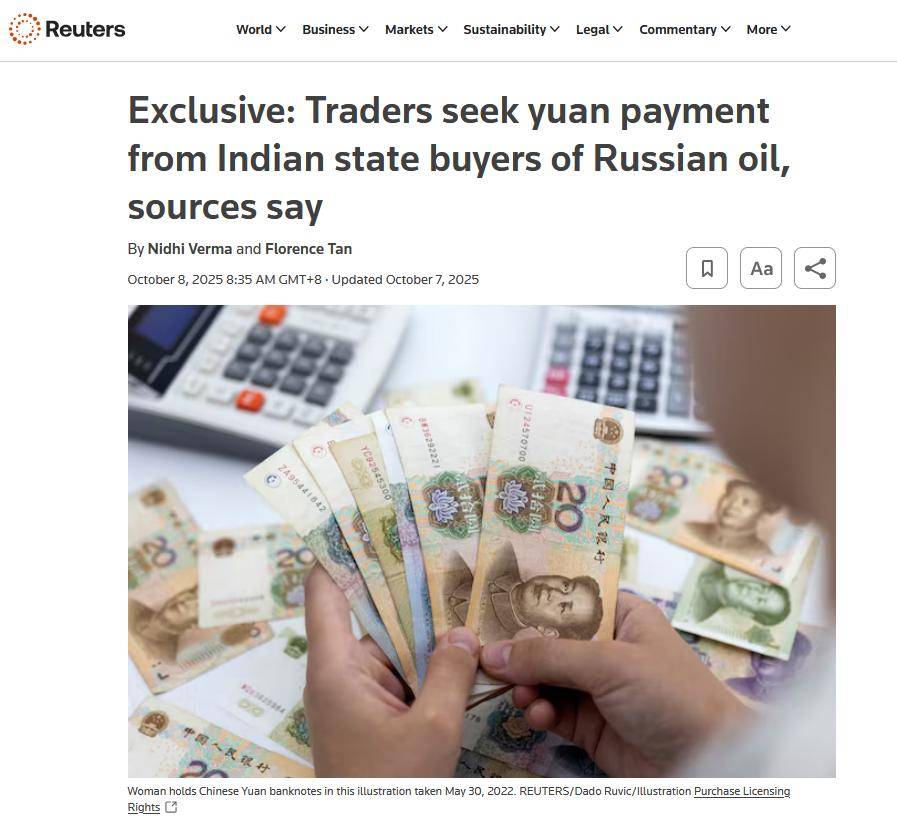 还是路透社在10月1日的报道,印度中央银行打算推进卢比的国际使用,结果几天后,却是印度连进口俄罗斯石油都被迫使用人民币了,颇有讽刺意味。