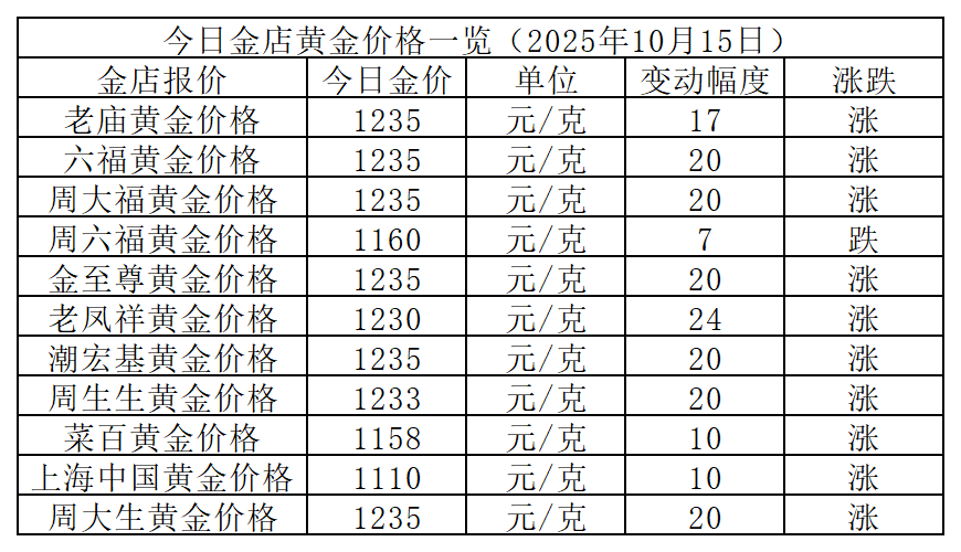 10月15日金价速报,国内金店黄金价格继续上涨,涨幅和昨日接近,维持在20元/克左右。其中,周大福等多家金店金价大涨20元/克,报1235元/克,并列最高价金店;上海中国黄金大涨10元/克,报价1110元/克,还是最低价金店。今日黄金高低价差125元/克,继续扩大。