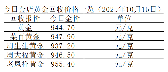 此外,今日黄金回收价格微涨0.2元/克。不同品牌回收价差较大,以下为部分金店回收参考价: