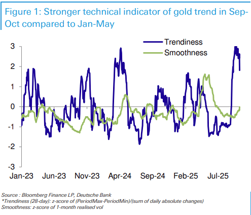 最后,从技术指标来看,德意志银行团队认为,9月至10月期间可能已出现"趋势性见顶"的迹象——他们的模型显示,金价偏离趋势的时间远超历史平均水平。