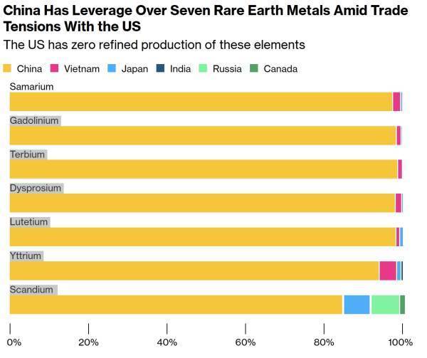 中美贸易摩擦背景下,中国掌握七种稀土金属的主导权,美国对这几种元素的精炼产能为零。(图表先后为钐、钆、铽、镝、镏、钇、钪)彭博社制图