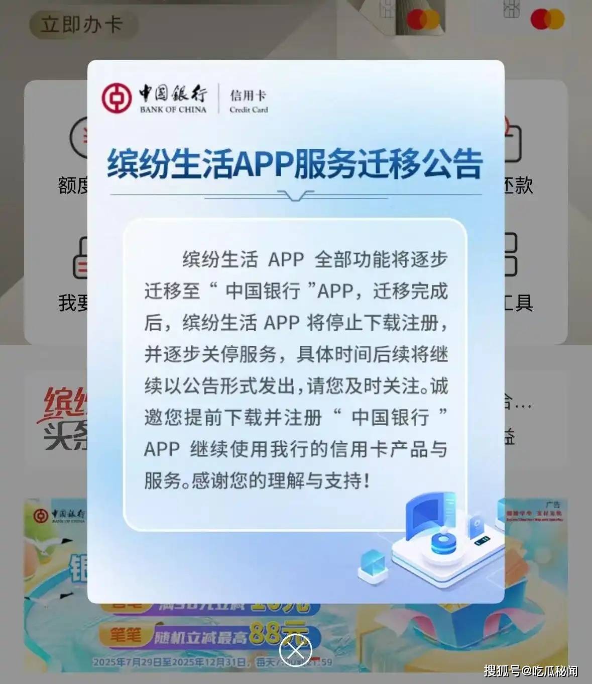 近期,包括中国银行、渤海银行、北京农商银行等十余家银行相继宣布关停旗下独立信用卡App,将其功能整合至手机银行主App。例如: