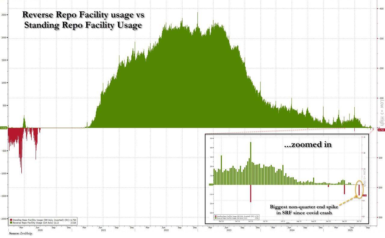 就在本周三早晨,美联储的常备回购便利工具(SRF)突然被大规模启用,单日操作规模达67.5亿美元,为今年二季度末以来最高,也是在非季末环境下自疫情以来的最大规模。