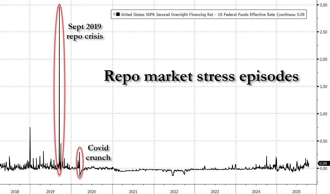 在当前环境下,联储降息本身已不足以缓解市场焦虑。市场开始寻找真正代表“流动性压力”的早期信号,而SOFR(担保隔夜融资利率)与联邦基金有效利率之间的利差,正是这类“预警指标”之一。