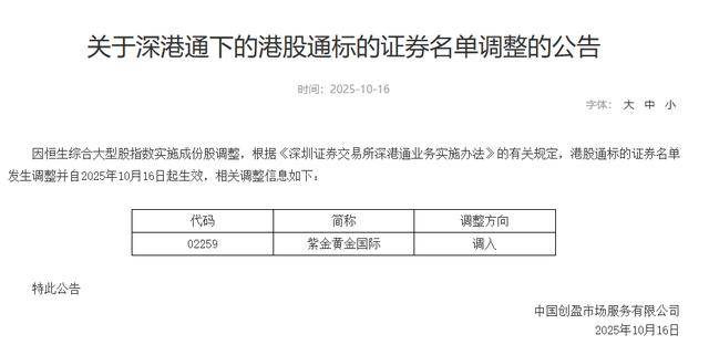 10月16日,深交所发布公告称,因恒生综合大型股指数实施成份股调整,根据《深圳证券交易所深港通业务实施办法》的有关规定,港股通标的证券名单发生调整并自2025年10月16日起生效,调入紫金黄金国际。