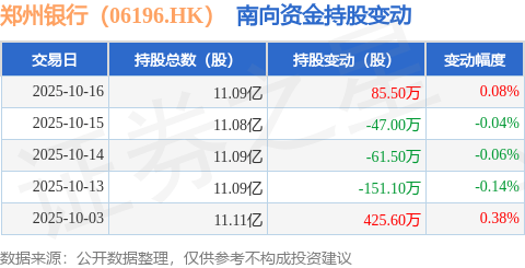 证券之星消息,10月16日南向资金增持85.5万股郑州银行(06196.HK)。近5个交易日中,获南向资金增持的有2天,累计净增持251.5万股。近20个交易日中,获南向资金增持的有11天,累计净增持736.14万股。截至目前,南向资金持有郑州银行(06196.HK)11.09亿股,占公司已发行普通股的54.89%。