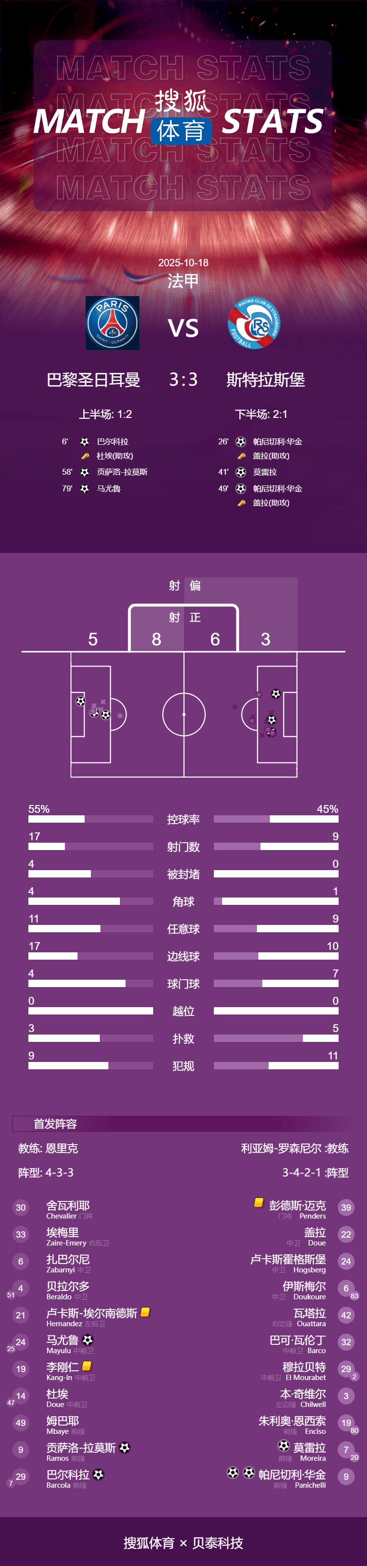 最终,巴黎圣日耳曼主场3-3险平斯特拉斯堡。
