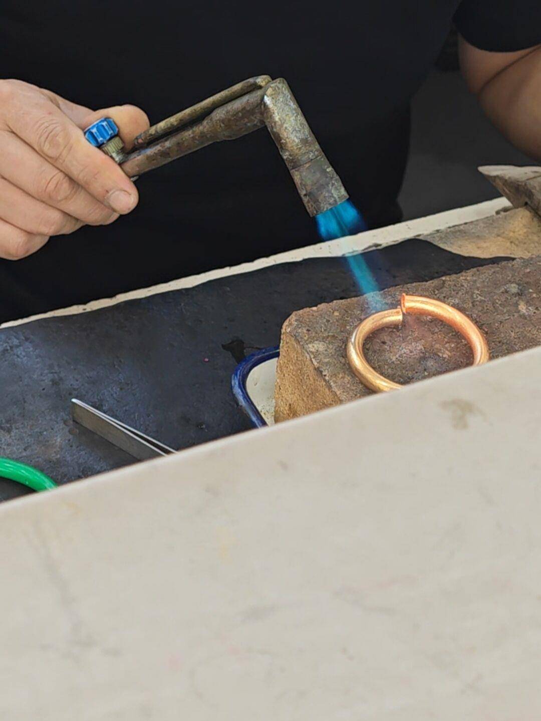18日,极目新闻记者来到南京一家黄金珠宝定制门店,店内有不少年轻的客人正在选款定制或排队,“打金”师傅忙得团团转。客人围在工作台前,目不转睛地看着黄金在高温下熔化,最终被打造成精美的饰品。