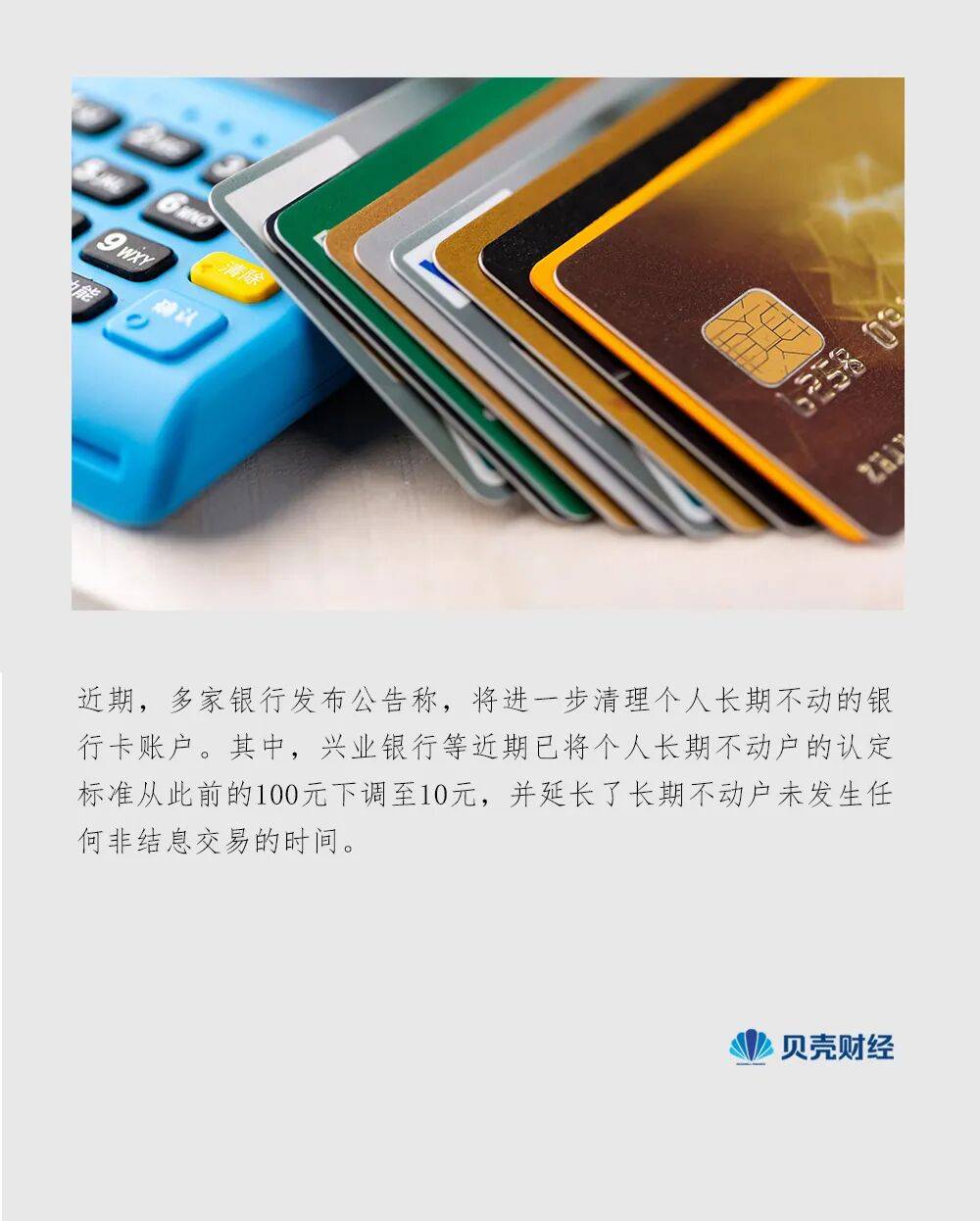近期,多家银行发布公告称,将进一步清理个人长期不动的银行卡账户。其中,兴业银行等近期已将个人长期不动户的认定标准从此前的100元下调至10元,并延长了长期不动户未发生任何非结息交易的时间。